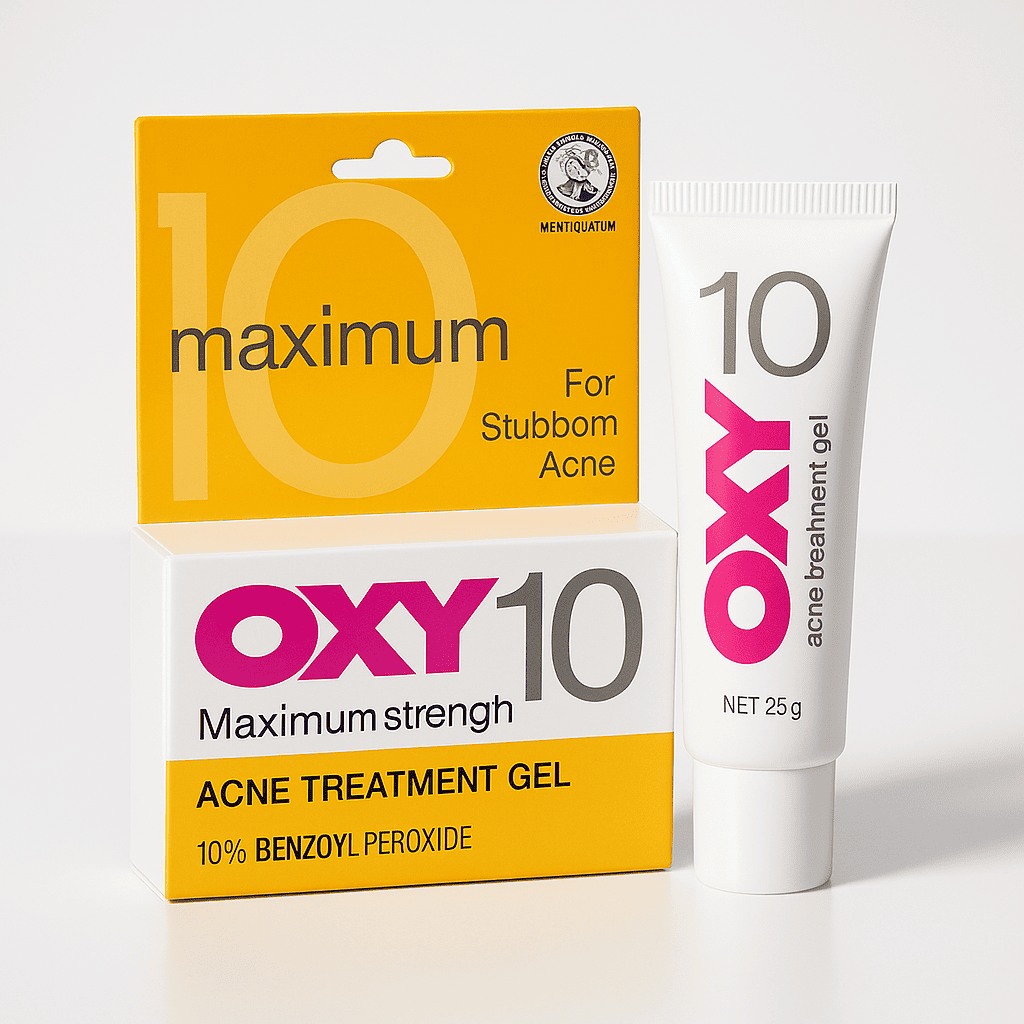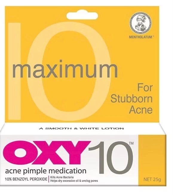 OXY 10 Maximum Strength Acne Treatment Gel is a high-potency formula made with 10 percent benzoyl peroxide. It penetrates deeply into pores to reduce inflammation, kill acne-causing bacteria and dry out active breakouts.